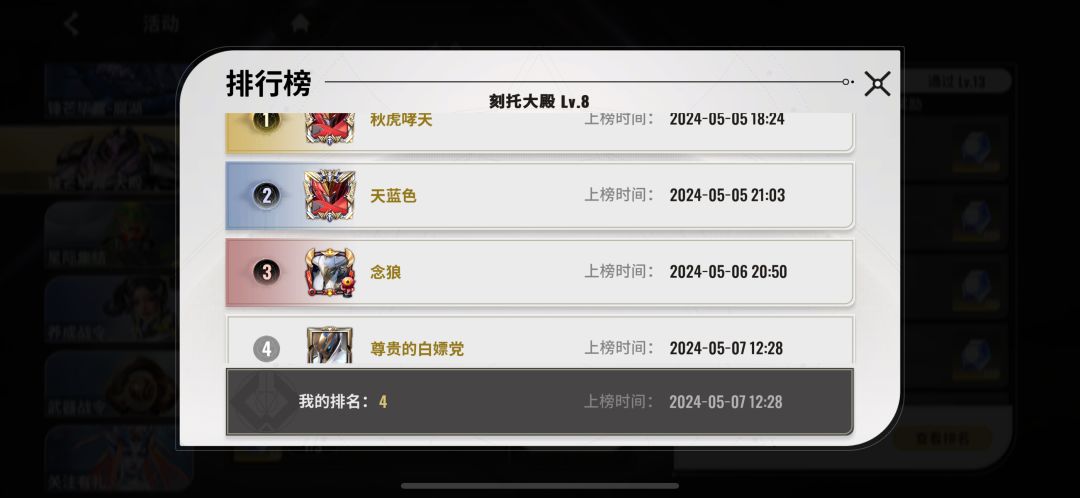 作为零氪,第四名已经很开心了,希望大家今早通关,拿到钻石,凑个10连,抽个三黄