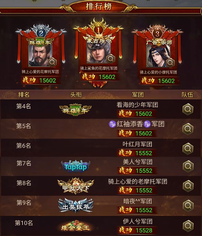 其中,骑上鲨鱼的花摩托、骑上心爱的花摩托、骑上心爱的小摩托、看海的少年、红袖添香 军团以 15602 的战功拿下目前濮阳之战最高战功纪录,赢得TOP5的宝座,恭喜!