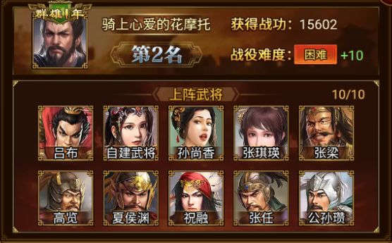 吕布、孙尚香、张琪瑛、张梁、高览、夏侯渊、祝融、张任、公孙瓒、自建武将*1