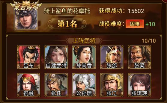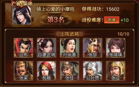 吕布、孙尚香、张郃、张梁、祝融、张任、公孙瓒、张辽、张琪瑛、自建武将*1