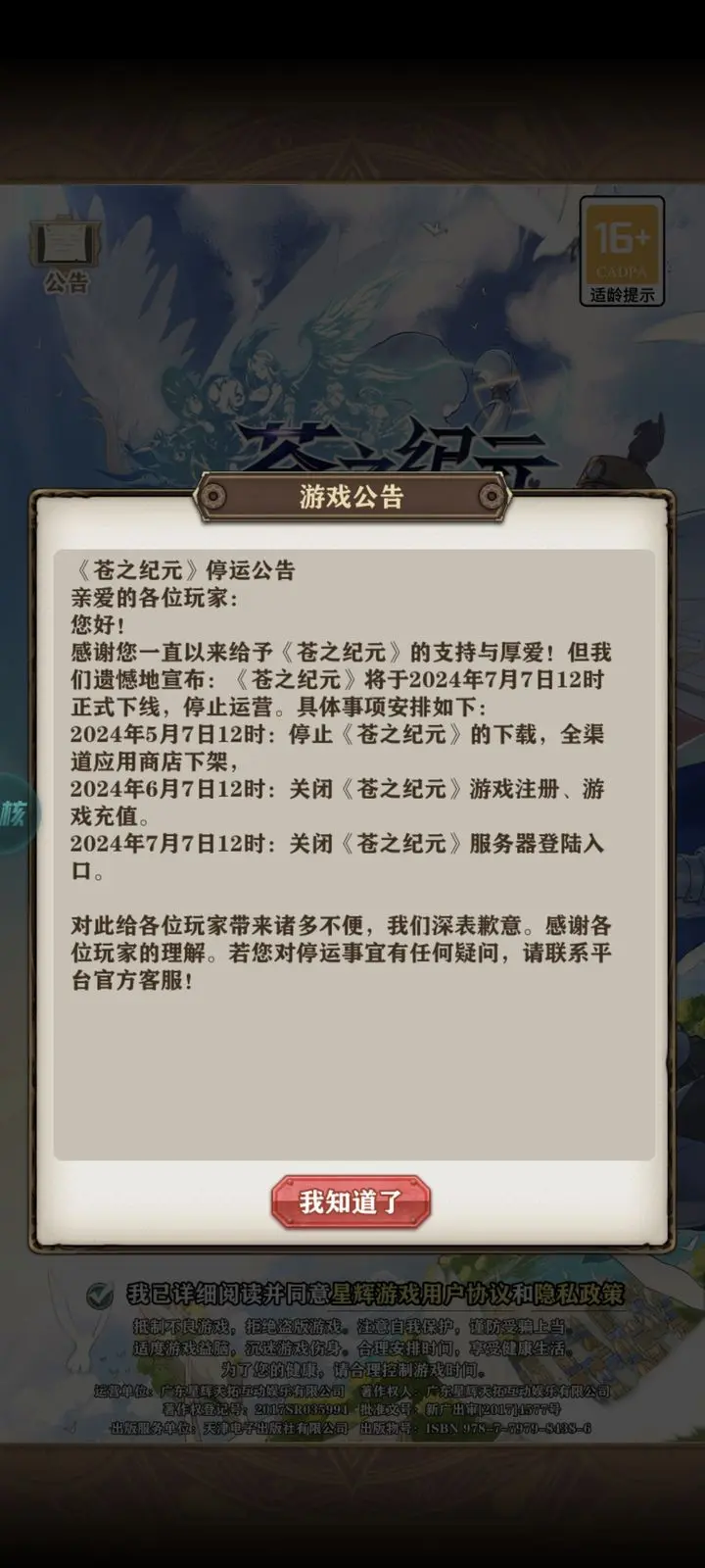 2024年5月7日12时:停止《苍之纪元》的下载,全渠道应用商店下架,
