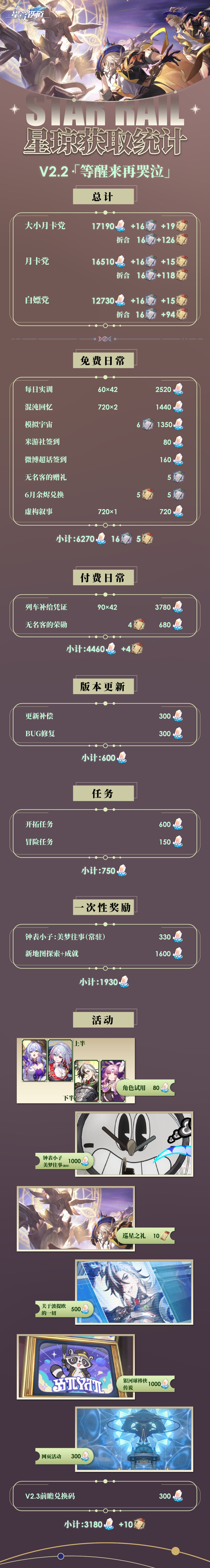 由于不同玩家的肝度和探索进度不同,因此新地图探索等方面的内容可获得的星琼部分在参与统计时,不会按可获得的最大数量进行统计。此外由于目前信息过少,活动部分的可获取星琼将参照之前版本情况进行预估。同时由于角色获取的不确定性,角色短信以及列车赠礼也不进行统计,因此开拓者们实际可获得的最大星琼数量将多于统计的数量。这样对于肝度没那么大的开拓者来说,获得的星琼量更贴近实际情况。