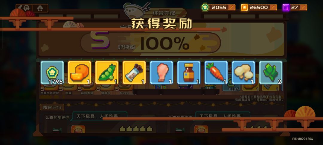上图是我自己的店,没有全用最高价值的菜品,很多用的都是必定S级的菜,招待用幻术,猫紫,砰砰队长每次收益必定1500以上。