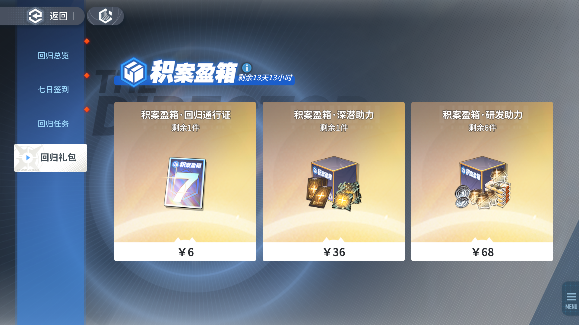 ¥6.00「积案盈箱 · 回归通行证」:购买后七日登录共计可获得X晶粒×1440、错金拓片×21、碎金便当×21;