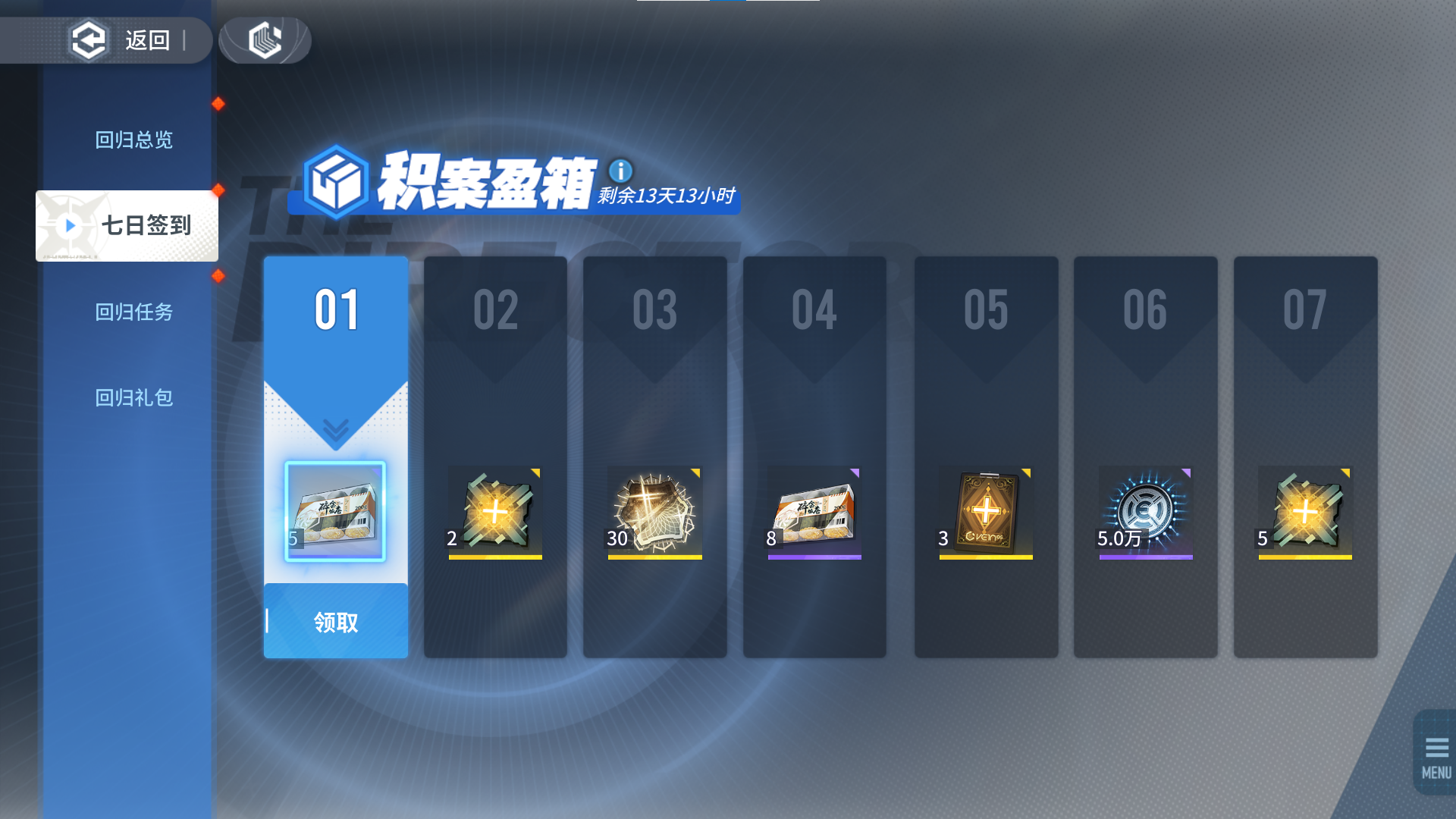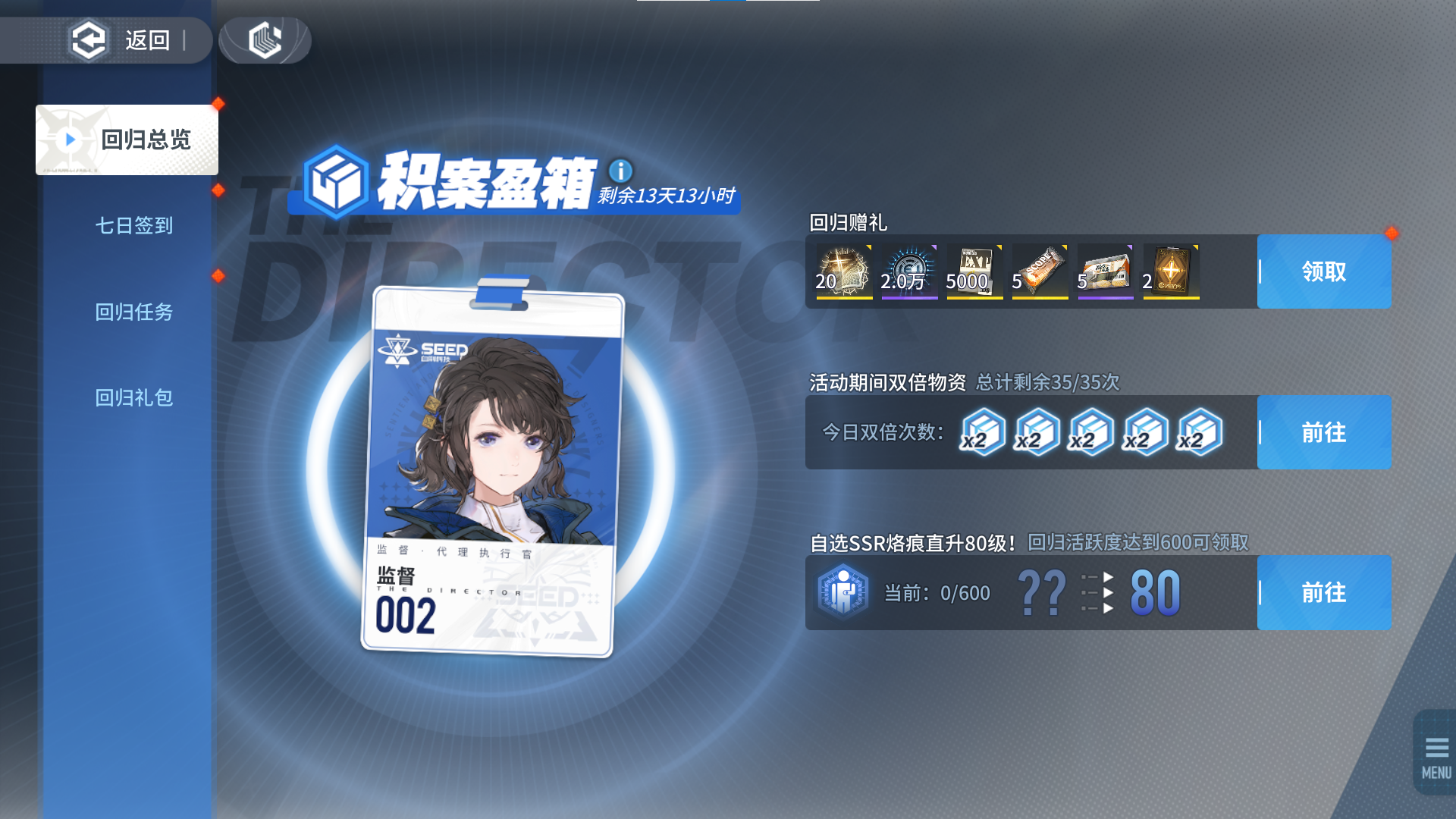 监督自回归当日起可参与「积案盈箱」回归活动,首次登录即可领取一次【回归赠礼】。活动期间将获得总计35次【双倍物资】机会。参与【七日签到】、【回归任务】可获得丰厚奖励。完成【回归任务】累积“回归活跃度“达到600可以获得一次【烙痕直升80级】机会。活动有效期为监督回归当日04:00起14天内,超过有效期将无法参与活动且失去奖励领取机会。已经购买的[积案盈箱·回归通行证]每日奖励将不受影响。