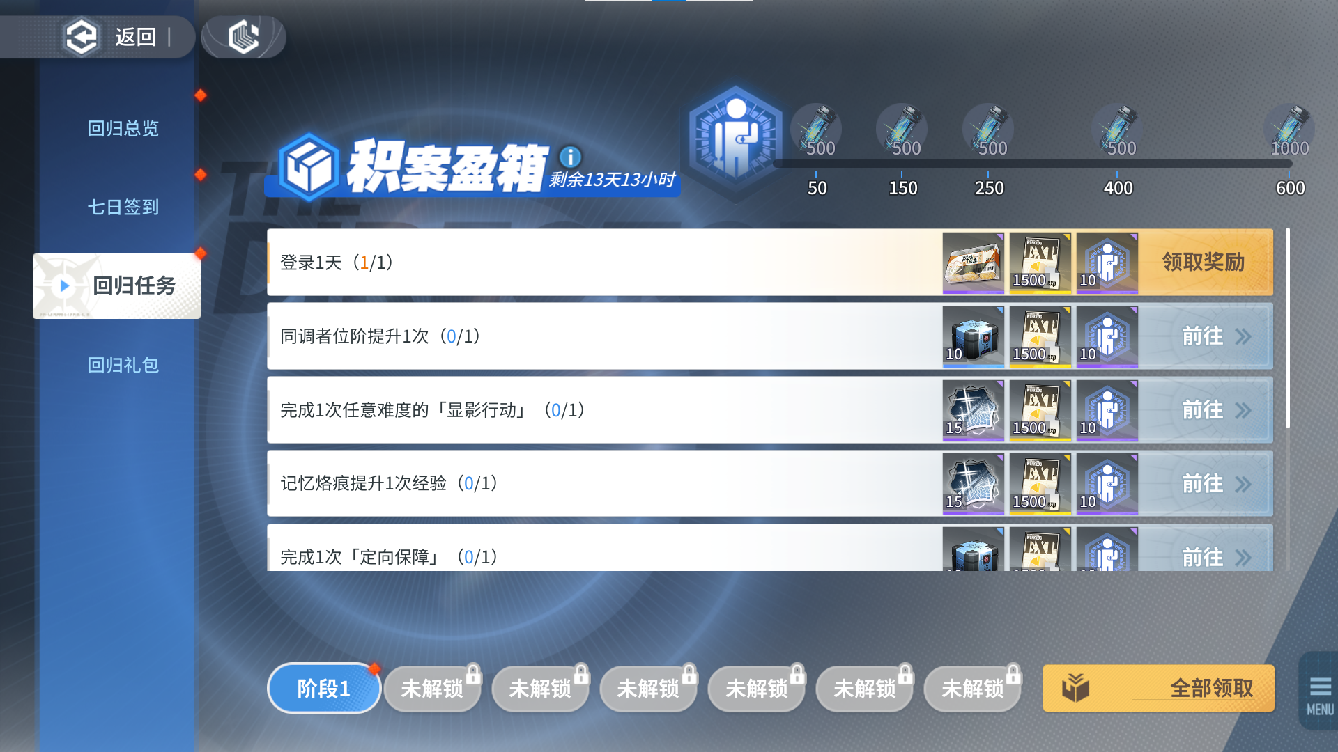 活动有效期内,监督每日登录游戏(包括首日)将依次解锁一个阶段【回归任务】,总计七个阶段。完成【回归任务】可获得丰厚奖励以及“回归活跃度”,累积到一定数量可领取阶段奖励。“回归活跃度”达到600可以获得共计X晶粒×3000与一次【烙痕直升80级】机会。