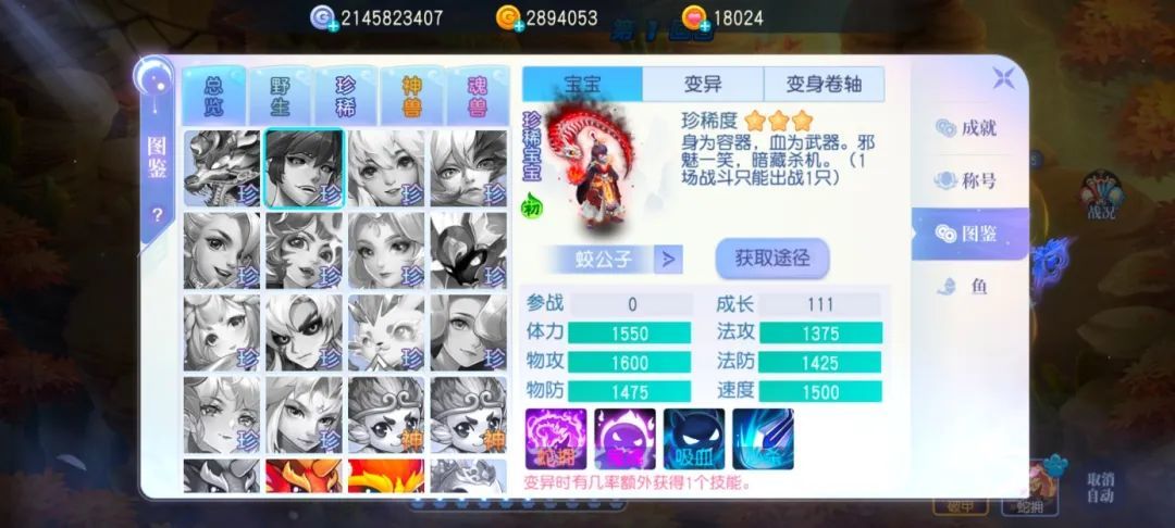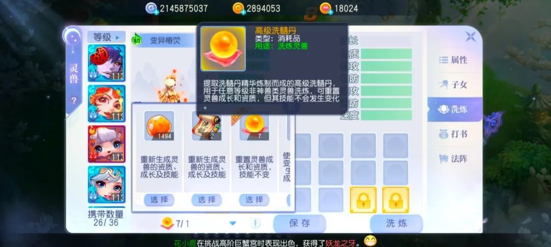 获得宠物后,就要开始洗炼大业。在这里大家要注意技能数量与成长资质。大家可以在宠物图鉴里查看。