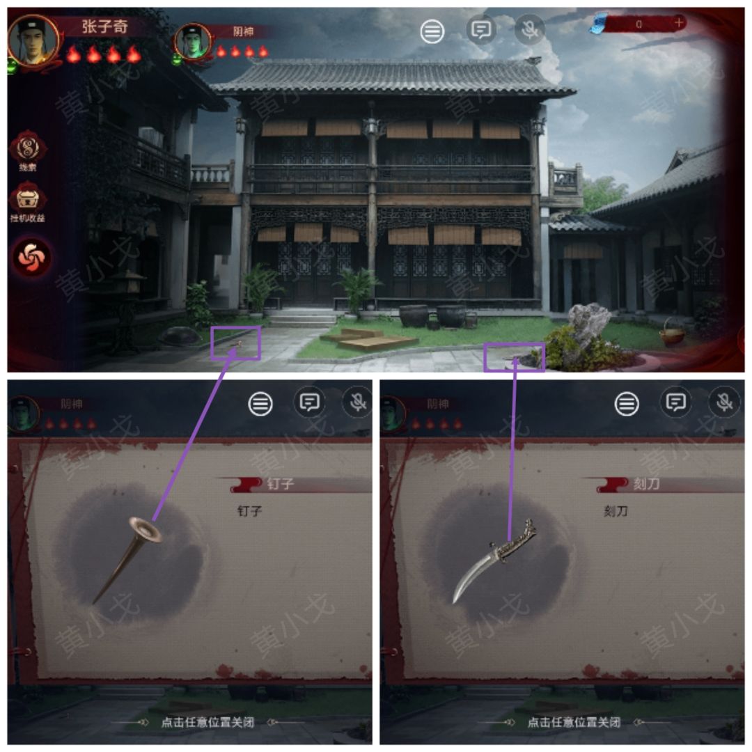 1.(院子)点击拾取地上的【钉子】;池子边上的【刻刀】