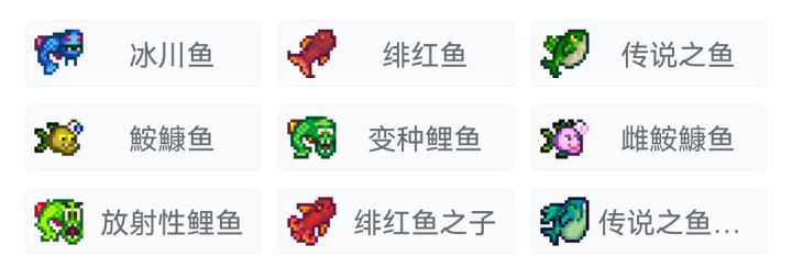 春季的Legend(传说之鱼)、夏季的Crimsonfish(赤红鱼)、秋季的Angler(安康鱼)、冬季的Glacierfish(冰河鱼)以及在下水道中的Mutant Carp(变种鲤鱼)。