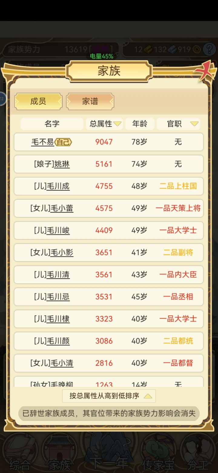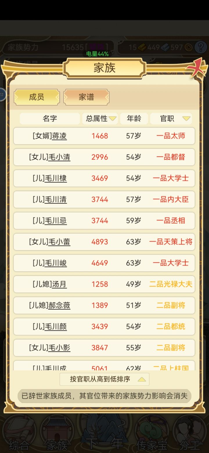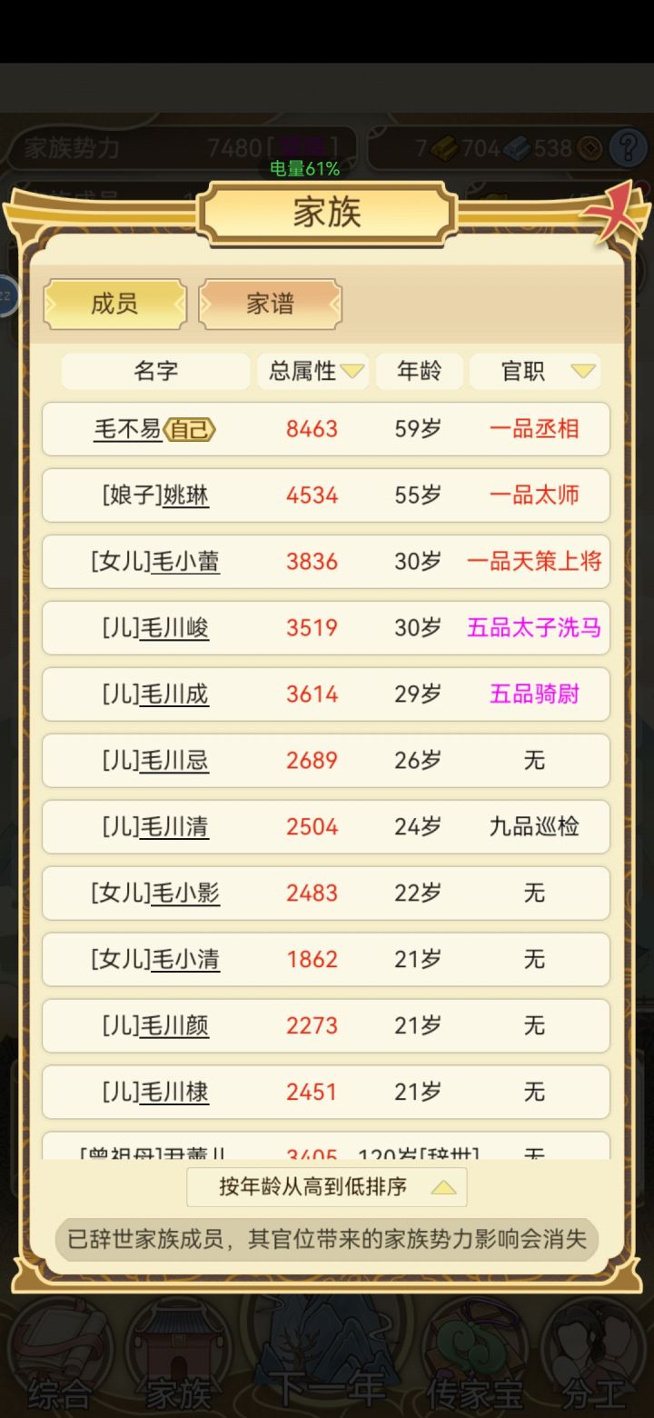 然后选个人口少的继承人,不超过三人,哪样老师随机三人基本就百分百,每年属性点都能增两百多。武将或文官属性超600,大会第一,年年都能升官。