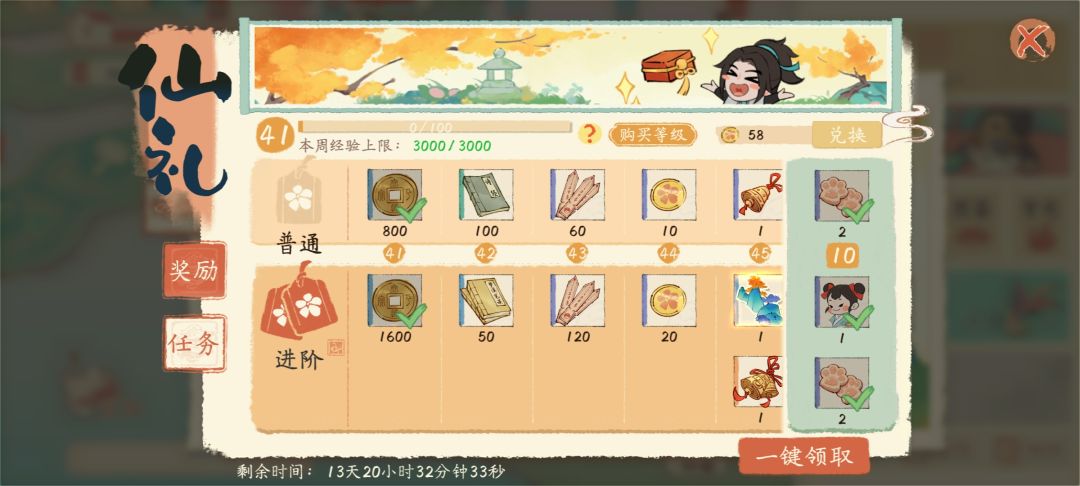 我算了一下,加上结缘手信换的猫爪饼干,68的战令一共是60抽,大概1元1抽吧,还有装扮,2个建筑繁荣度快300了