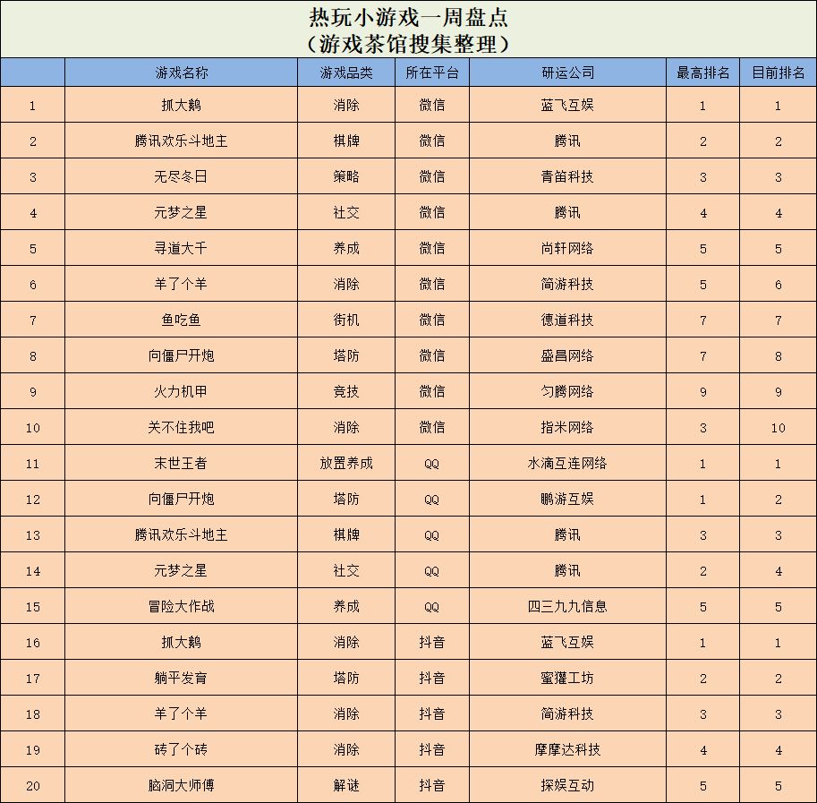 休闲新游周报每周统计微信小游戏、QQ小游戏、抖音小游戏、硬核小游戏以及App Store和Google Play上的新游爆款,并按照分类制作表格,将游戏排名情况等信息公布,希望给到行业同侪帮助。
