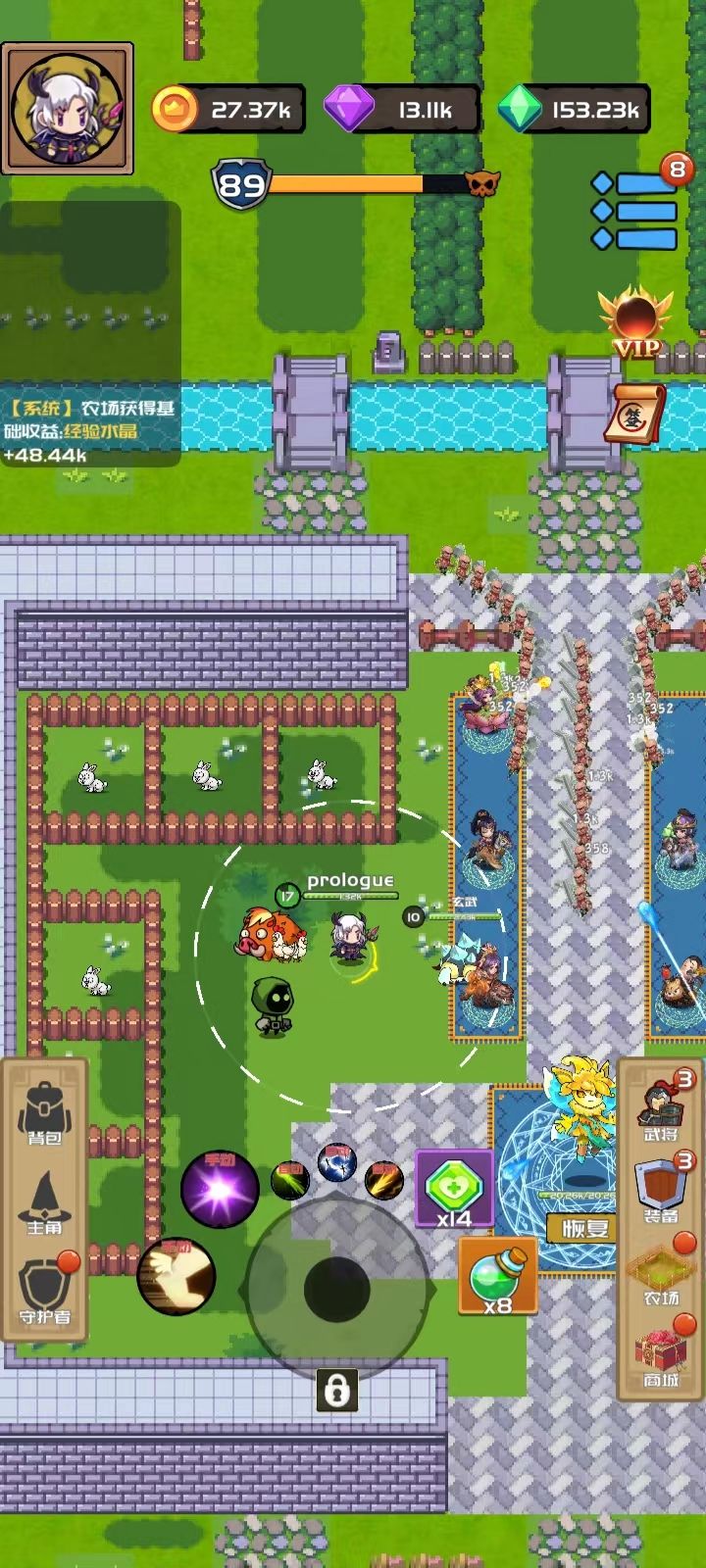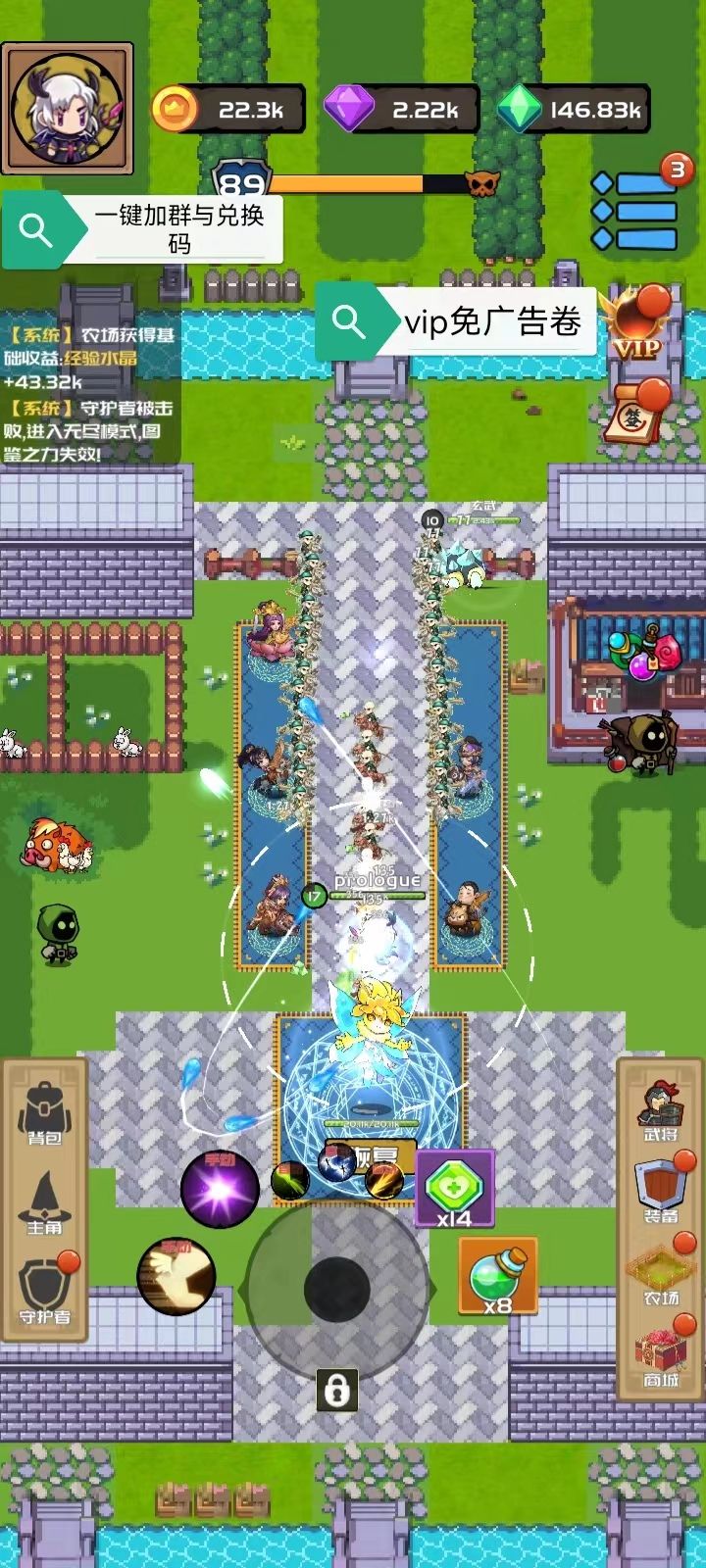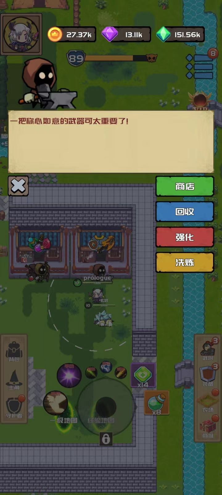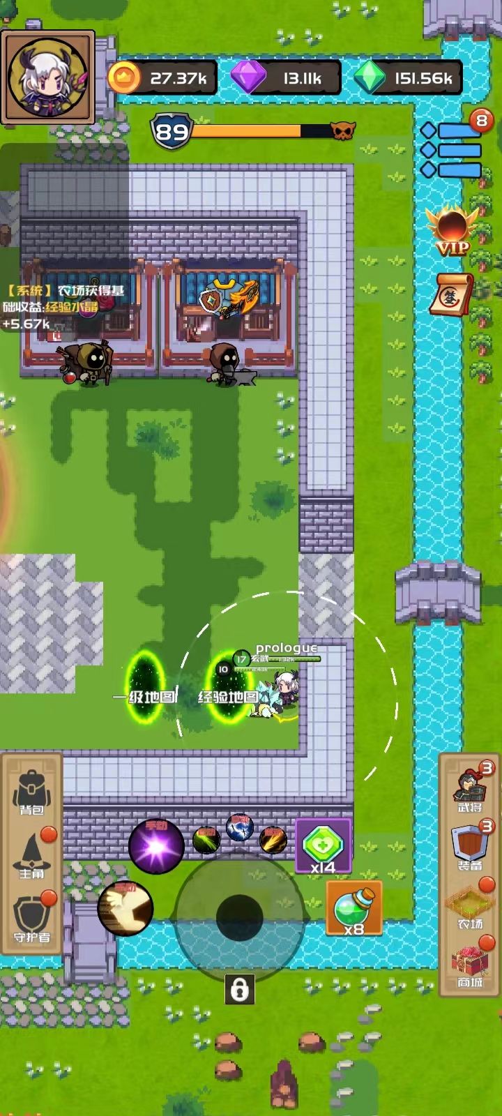 我们就可以来到城内右下角得经验地图 ,打开背包菜单点击使用8级弓箭手道具 让弓箭手配合群体回复药品负责练级升级