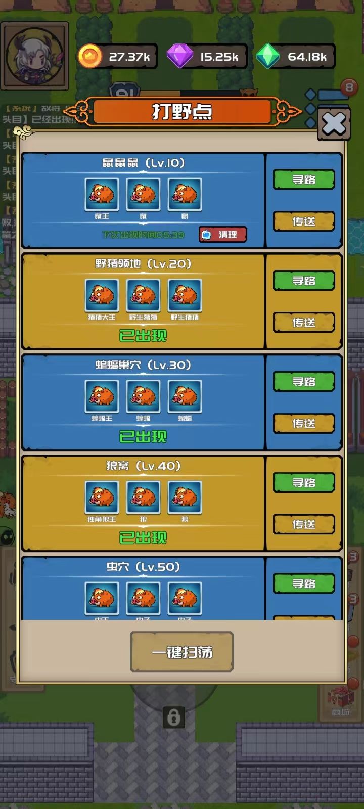 重点是第二个图片 点击打野菜单。可以看见boss刷新时间方便离线 时间把握,可以通过看广告快速清野物品直接加入背包。