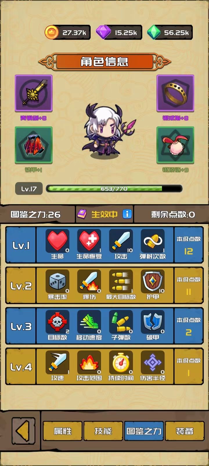 最后角色菜单中 角色可以进行技能设置,技能升级(使用未知材料),装备穿戴,上图所示图鉴之力,每收集到一件新得道具装备物品等 图鉴之力“点数”就会加1点 图鉴之力可以随意更改“洗点”最前期建议点数 加在攻击 防御 破甲属性,攻击速度上。破甲属性到“一定程度”可以一定程度上越级打怪