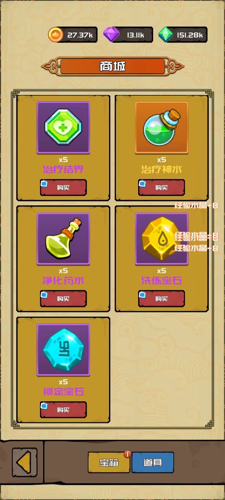 在道具商店得右边进入装备商店,可以购买装备强化石(建议每天买光) 装备升级与无损耗退回升级材料