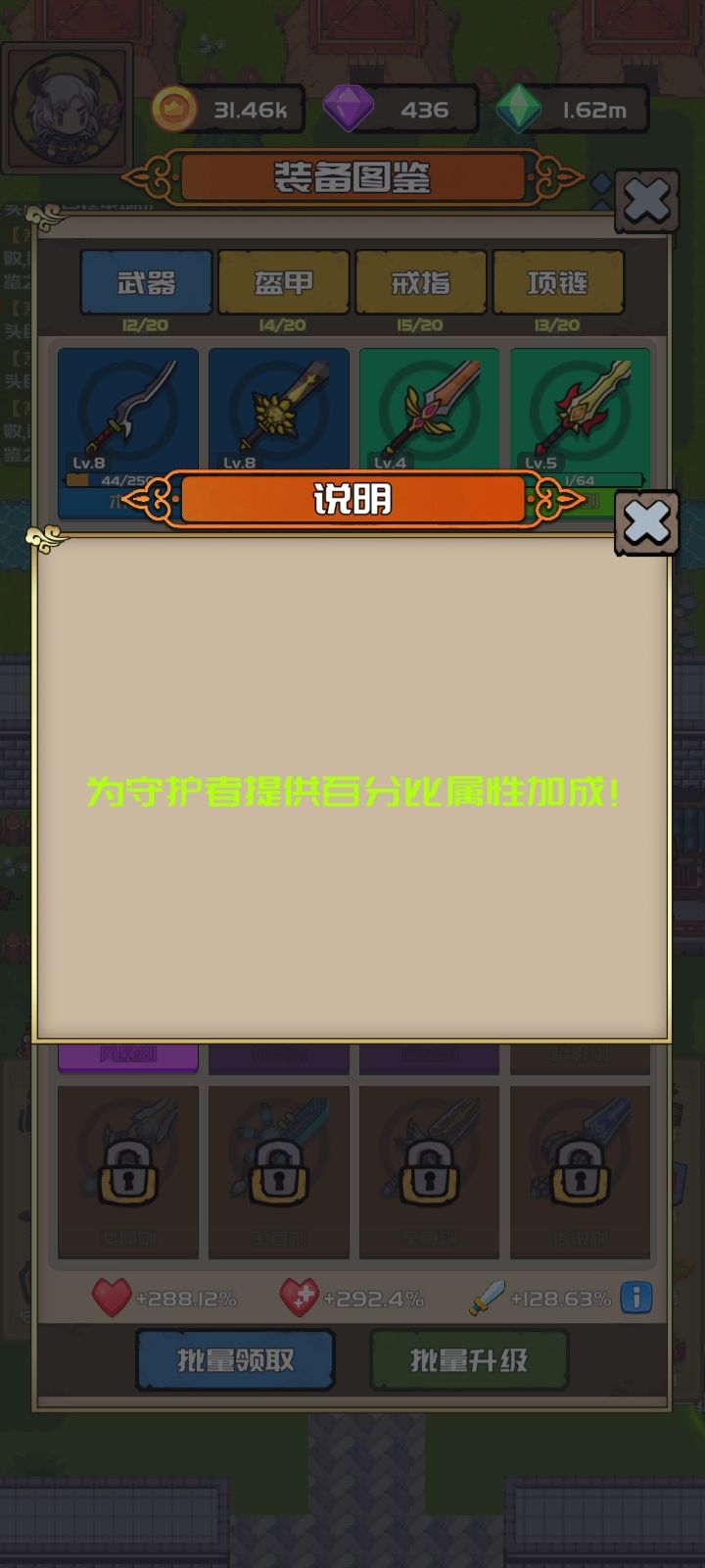 守护者是升级培养方式,分为属性升级与技能升级(建议”可能的话?“优先升级守护者技能(可以通过农场双倍收益达成))守护者每多一种技能与攻击方式过关就更快,可以获得更多得守护者升级资源