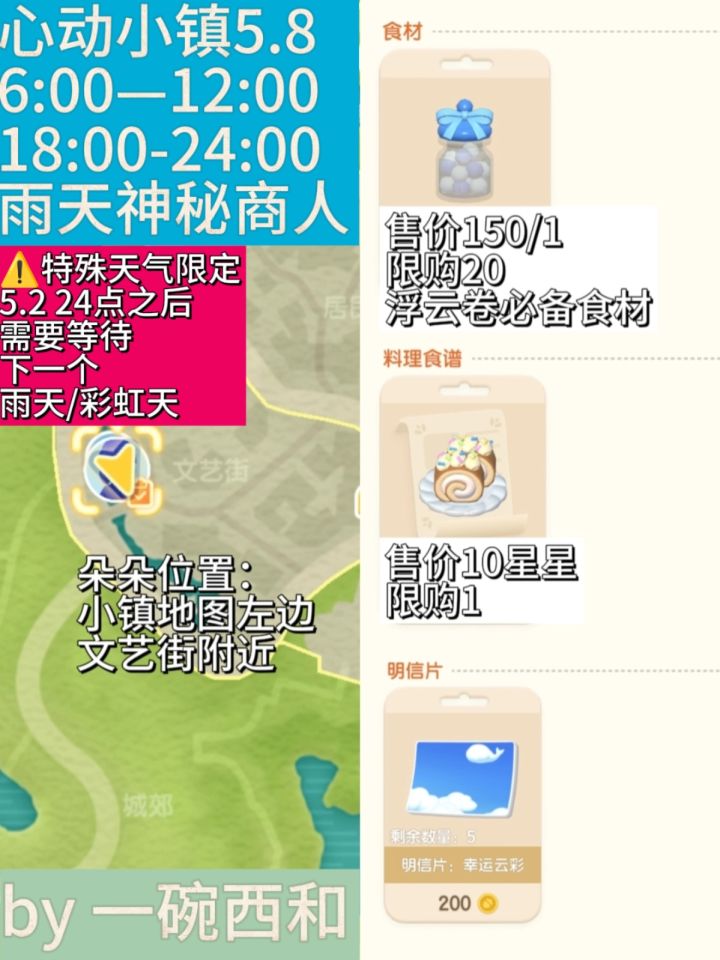 朵朵会在今天6:00–12:00 18:-24:00【两个时间段】出现在小镇上,需要做任务“【雨与彩虹】—感受小镇的雨天并找到朵朵”的发展家不要错过哦!