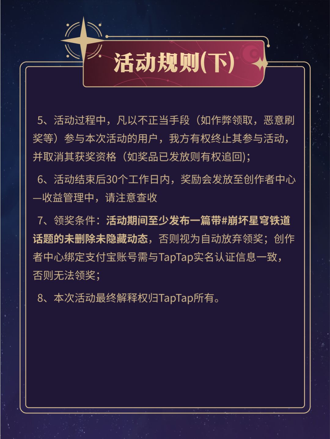 💡领奖条件:活动期间至少发布一篇带#崩坏星穹铁道 话题的未删除未隐藏动态,否则视为自动放弃领奖;创作者中心绑定支付宝账号需与TapTap实名认证信息一致,否则无法领奖