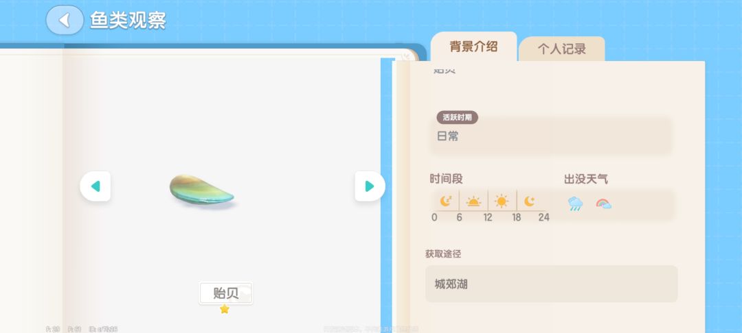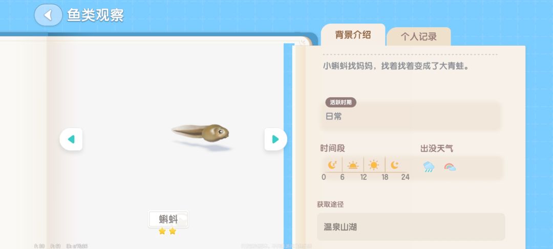 2.去城郊湖钓贻贝,去火山温泉湖钓蝌蚪;这两种鱼都只有彩虹天和雨天出现(且所需钓鱼等级较低)。