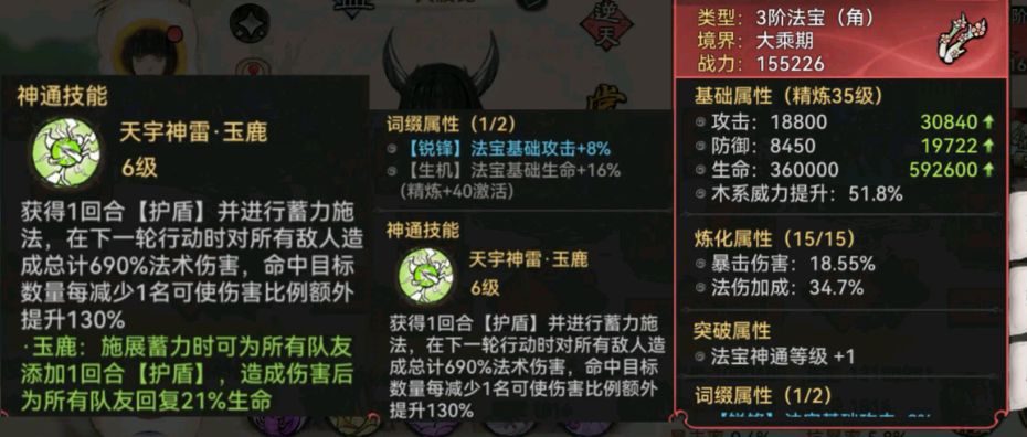 如果你的前排是熊猫、蛊法宝是角的话,熊猫技能带松风和拈花,法宝带龙玉,如果是五行禅,让五行禅带凤魂,法宝就可以换成木头或者花(花是加法宝蓄力的),木系加成可以通过本命配方去搭配,因为我懒,所以也不去想吃威力加成,我用的主法宝是木头(熊猫是列阵套,木头生命加成50%,可以让开局的盾更厚),配方是木头、龙玉、花,可以随时切换。如果五行禅带拈花和凤魂,就需要另外一个前排带松风了,松风减冷却真的很重要,是巫蛊队不断debuff的关键。带拈花的熊猫如果死的就剩它了,它会用拈花满蓄力,然后用龙玉拉起来秦冰,从而复活全队。