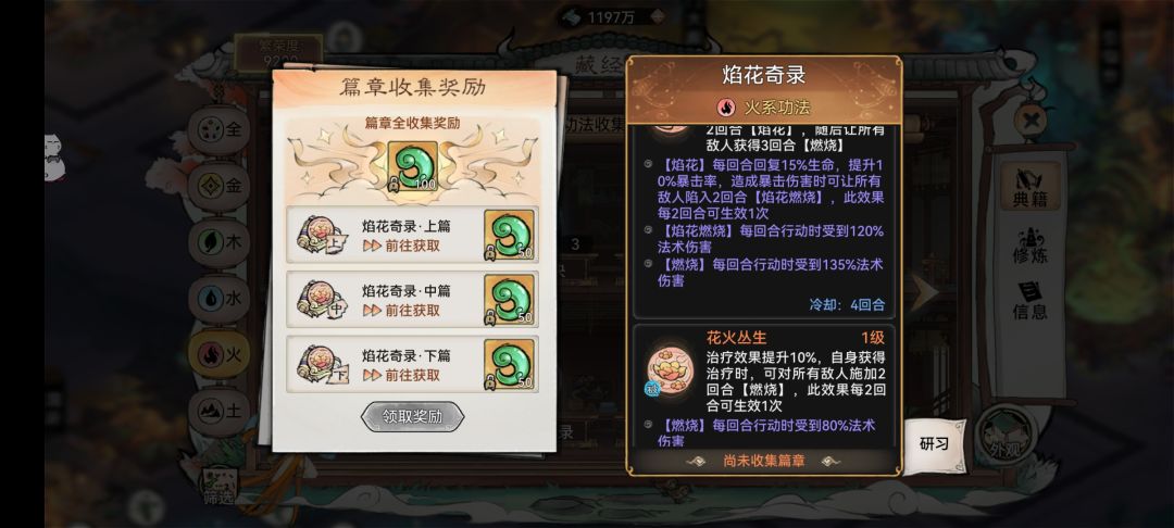 1、焰花奇录+御火诀(变异天火灵根)