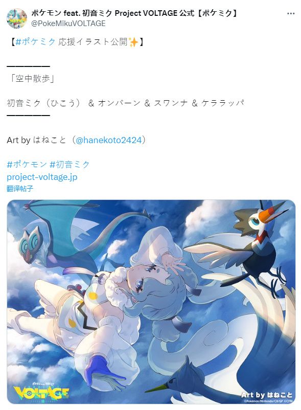 “初音未来×宝可梦”联动企划官方今日公开了最新的应援插画图“空中漫步”,该图由はねこと绘制,主题为飞行系的宝可梦和初音未来。