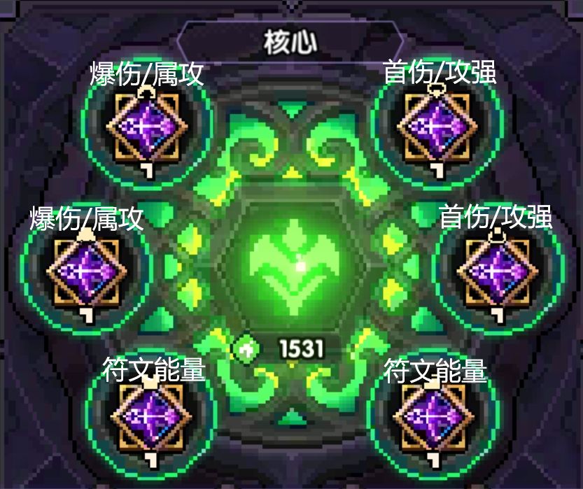 大符文对应六个装备的位置,胸甲跟鞋子部位绑定符文能量,蓝色紫色就行,其他随便。没过100层没办法造新bd的符文,所以开荒用不了新bd(氪金倒是拿得到,不过这是新区竞速的做法)。