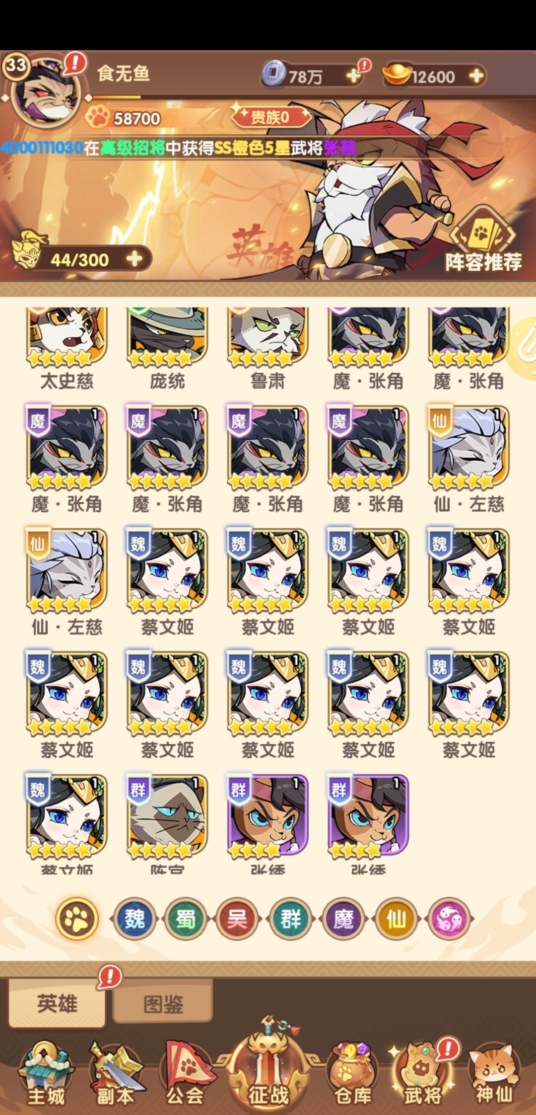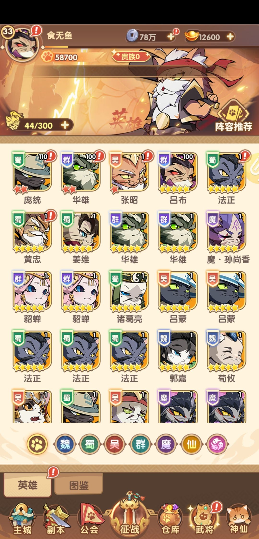 因为只有一个吕布,最高只能升到100级。打不动图,所以升了庞统和华雄。