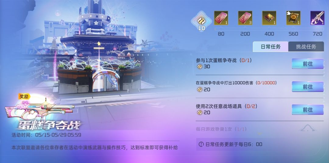 奖励增益阶段:璀璨蛋糕出炉,幸存者参与日程必做可以获得额外奖励,庆典开启,重启半载,璀璨时光!奖励增益时间:2024年5月22日06:00-2024年5月29日05:59