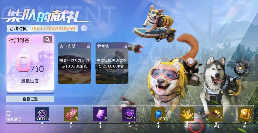 它来了!它来了!阿柴“队长”带着汪汪队走来了!在杜加河谷、尖叫戈壁、伊甸城等地图中完成指定探索任务,累计探索进度可获得璀璨召唤券、聚核晶源、原晶、S级战甲组件等丰富奖励,真·汪汪队立大功!活动时间:2024年5月15日-2024年5月29日06:00