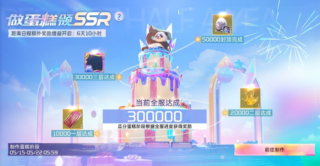 制作蛋糕阶段:幸存者们通过日常副本、对答如流和物资筹备获得蛋糕制作材料,每次提交材料制作璀璨蛋糕均可获得奖励!每人每日仅可提交3次哦~当全服累积提交的材料达到指定数量时(具体制作数量需求以游戏内全服数量为准),大家还将获得限定头像框、SSR宠物蛋「果赖」等好礼!制作蛋糕时间:2024年5月15日-2024年5月22日05:59