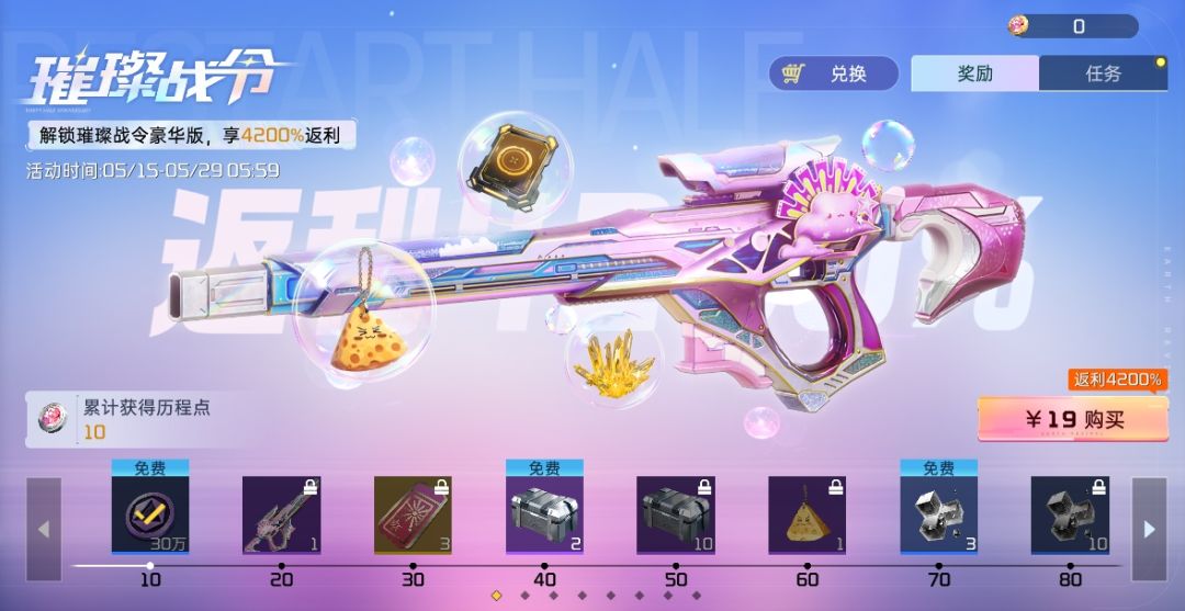 璀璨时光,每一刻都珍贵!完成任务累积历程点数,可免费领取高级宠物选召券、原晶、超凡芯片晶体、芯片升品秘钥等奖励!购买璀璨战令不仅享4200%返利,更可解锁太阳风武器皮肤「半岁·烟云」「奶酪挂饰」等多重奖励!活动时间:2024年5月15日-2024年5月29日06:00
