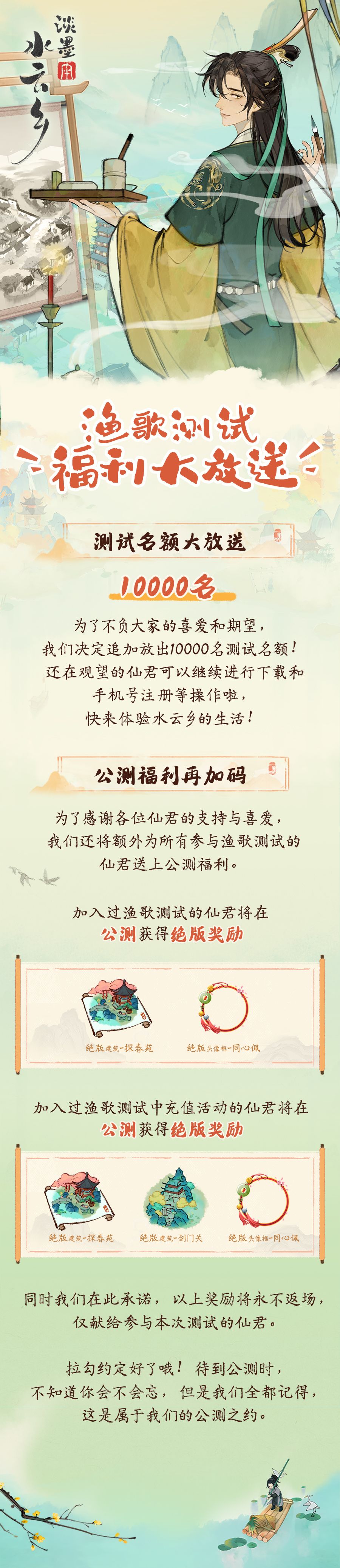 诚邀参与本次渔歌测试的仙君,做为淡墨水云乡的“成长见证者”!