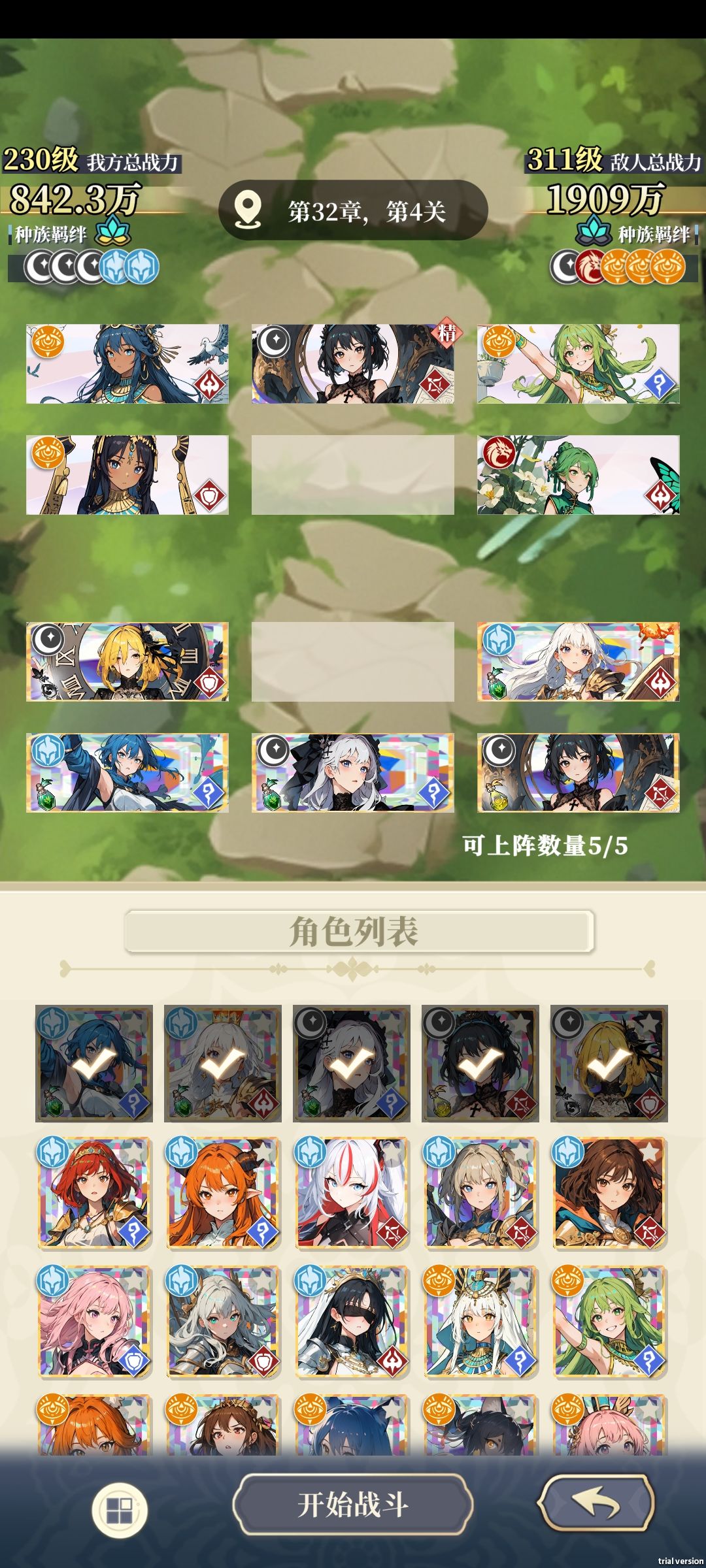 前期500万战力以下哪个角色等级高用哪个,随便用都一样。简单说下之后的攻略,目前我用三月影二银海打到32-4两个满级 三个三级感觉还可以,我昨晚12点左右才开始玩的所以限定角色没有 欧皇非酋角色也没等级!这阵容搭配目前手中角色感觉是我发现能打的下去的!装备目前也没能强化。推荐一黑白 四翡翠或者五翡翠,字条什么的有啥用啥吧!没试过五群法不知道咋样!别人说夕诸 T0可能后期血量和伤害起来了可能需要用到免伤!首先没啥子装备所以目前我感觉就是免伤无大用,角色血量太低敌人一轮AOE全挂彩。所以只能想法子先秒了对面。免广太难弄了花了起码五个小时。后面才一直抽了500W左右吧实在是抽不动了。角色等级都没上去![[表情_冷漠]](https://img-tc.tapimg.com/market/images/e1e1b4338e93daed92ef8caccc555f42.png)