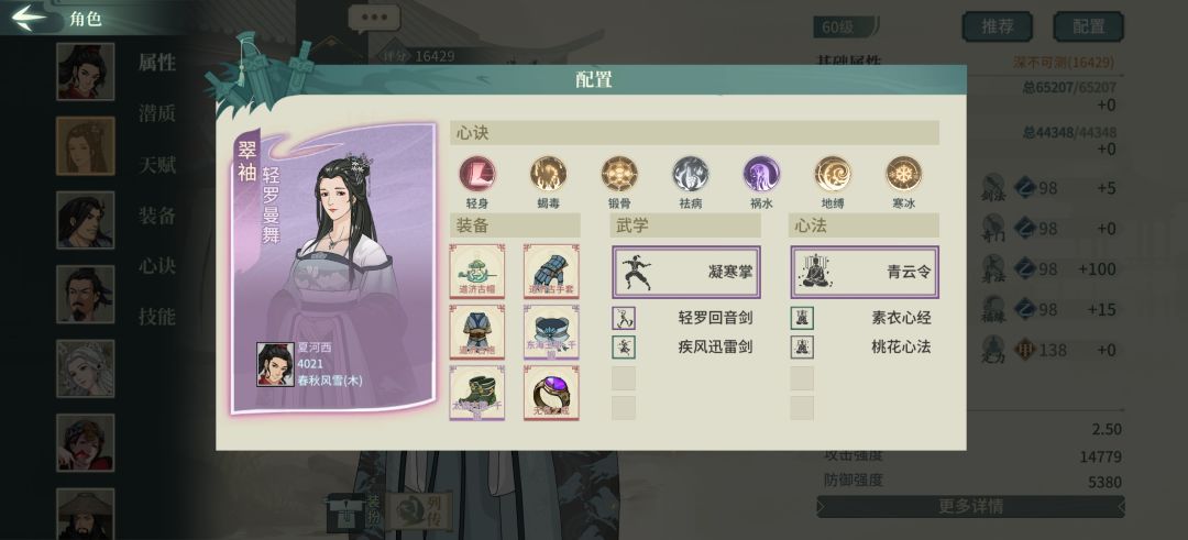 翠秀是套路的精髓,因为炸盾技能开局有冷却。所以想首回合启动就要保证加盾手翠秀的行动次序,同时给顺位的炸盾手开局减CD。这里给回怒戒指保证开局怒气来加盾,太古鞋和东海腰带提身法。心法和心决主要拉内力值和负面穿透。