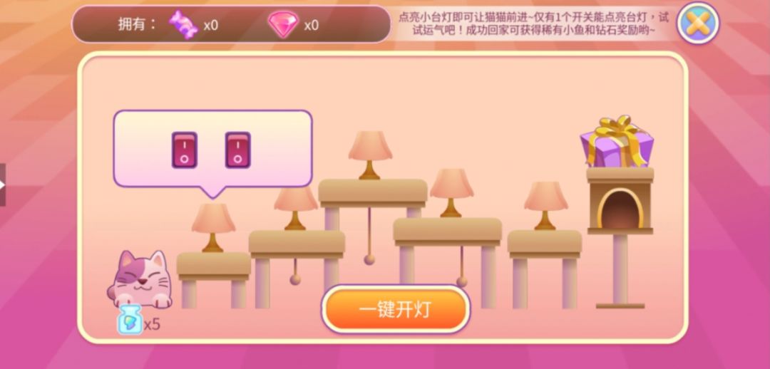 从开关中选择一个点亮台灯,成功点亮台灯即可让喵咪前进一步,将喵咪送回家即可获得奖励。