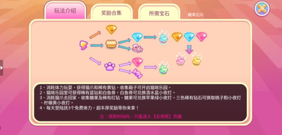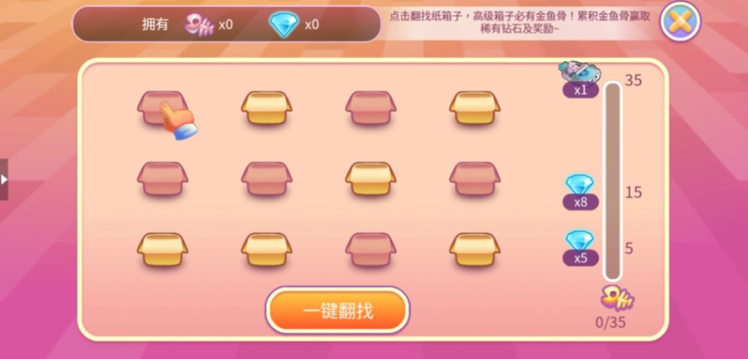 收集一定数量的纸箱之后即可进入猫咪乐园,在乐园中点击翻找纸箱可以获得奖励,高级箱子必有金骨鱼,累积金骨鱼可以获得钻石进度奖励。