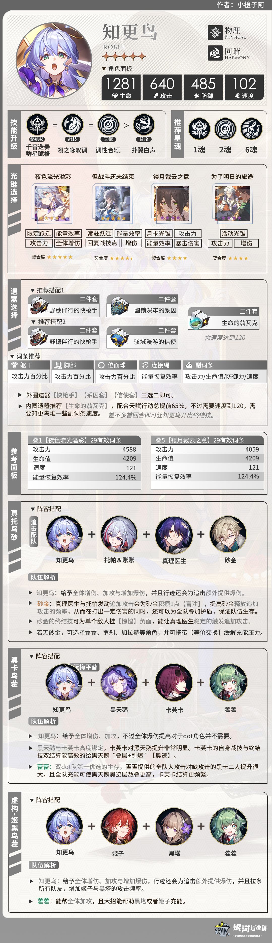 「知更鸟」是一位物理属性的同谐命途角色,作为辅助位,知更鸟辅助能力非常全面,集增伤、加攻、爆伤、拉条于一身,并且还能打出可观的附加伤害。对攻击频率高,尤其双C队伍辅助甚佳。