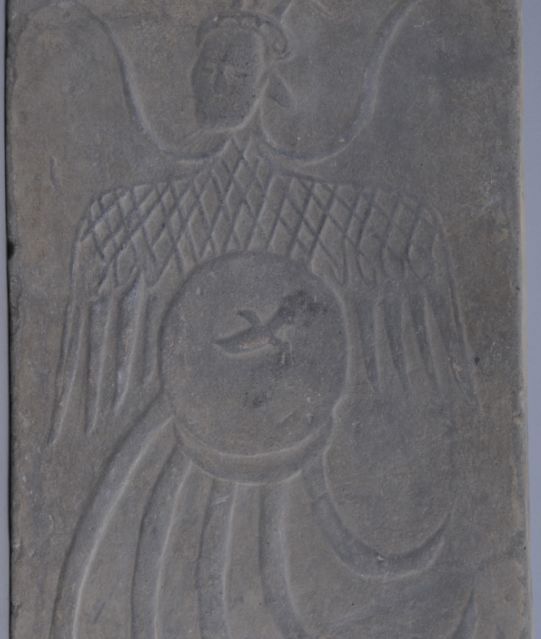 图为一人首鸟身像,头微向左,尾羽右飘,头戴三尖山形冠,胸负圆轮,轮中一乌。《淮南子·精神训》曰:“日中有 鸟”, 鸟,即人们常称的阳鸟、金乌。金乌是日的象征,载乌者为日神。