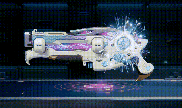 枪身整体采用珠光设计,梦幻的配色好像将星河揉碎化进了枪里,让你从任何角度都能看到偏光~紫色水晶镶嵌其中,散发耀眼光芒!握把处的圆盘绽放出摇曳烟火,绚烂到足以点亮夜空~