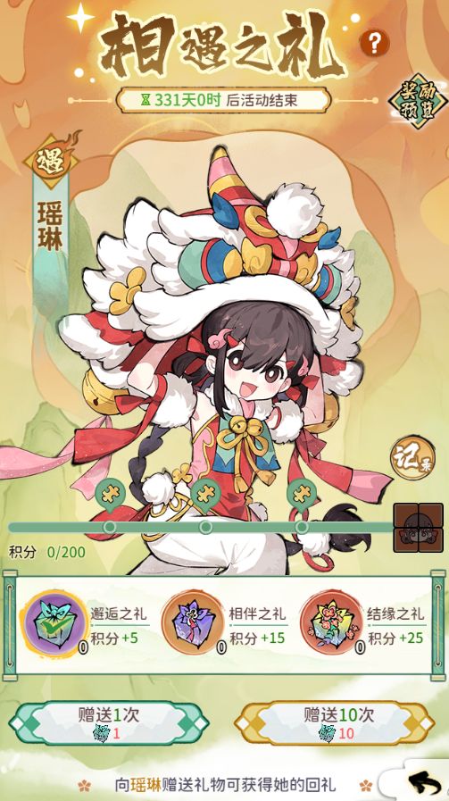 相遇之礼活动限时开启,本期弟子瑶琳 赠送礼物可收获道具回礼,消耗积分可兑换瑶琳。