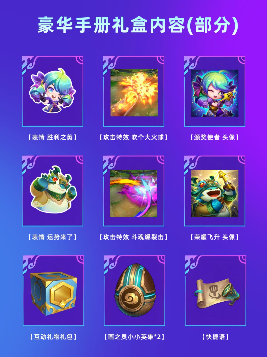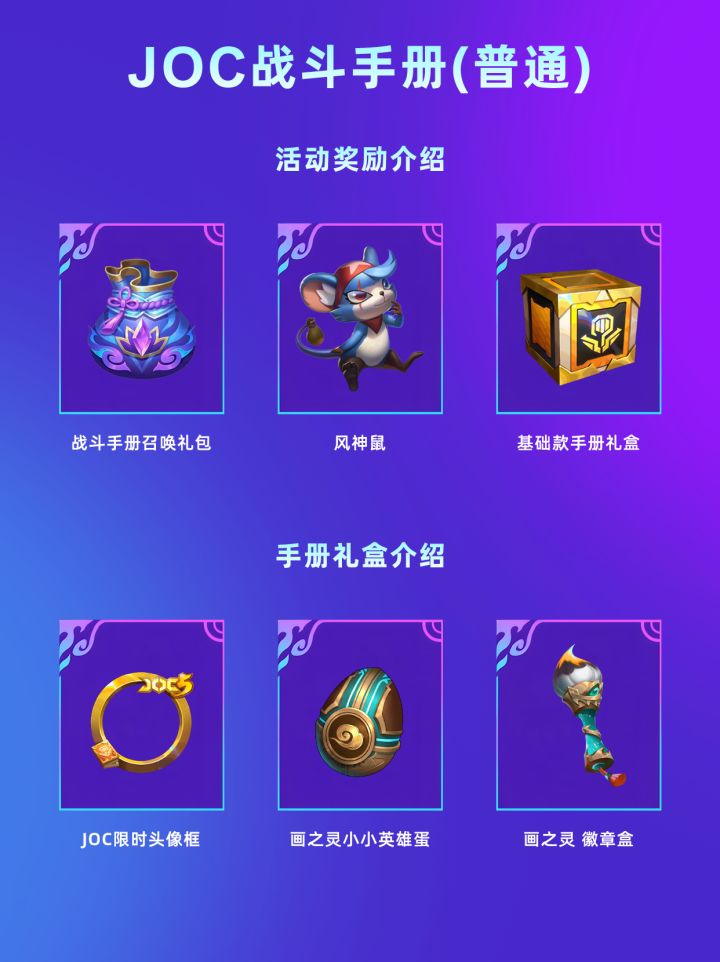 普通版手册奖励包括:小小英雄【风神鼠】、【画之灵小小英雄蛋】、【战斗手册召唤礼包】、【JOC限时头像框】、【画之灵 徽章盒】等等