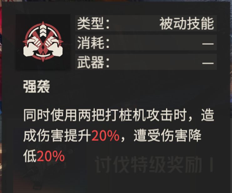 强袭:特别好的效果,极大提高了卡米拉与敌人死斗时的战斗力,而且对于一众使用双把格斗武器的机师来说有较好的适用性,但是需要注意,只有双手都为打桩机才能生效。