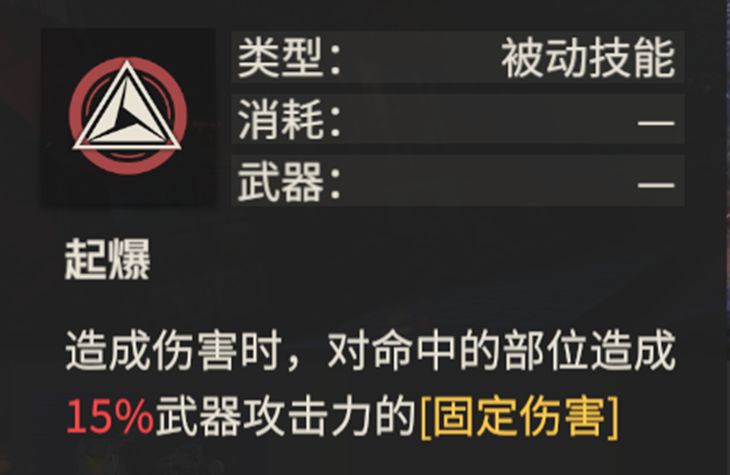 起爆:攻击时对命中部位附带一次固定伤害,提高斩杀线,有时候这一点伤害直接决定了能否消灭敌人和再动,是不错的效果。