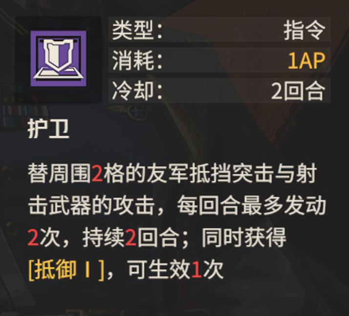 护卫:守护者人手1个的初始技能,将援护范围提高到周围2格,不作赘述