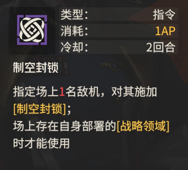 空封锁:对策性技能,需要配合战术领域使用,能够使敌方1个单位无法使用战术武器对战略领域中的我方目标造成伤害,持续到回合结束,相当于让敌方战术家一回合哑火,无论是pve中抵挡boss的关键战术攻击,还在是将来的pvp作为处理敌方战术家,都有不错的发挥