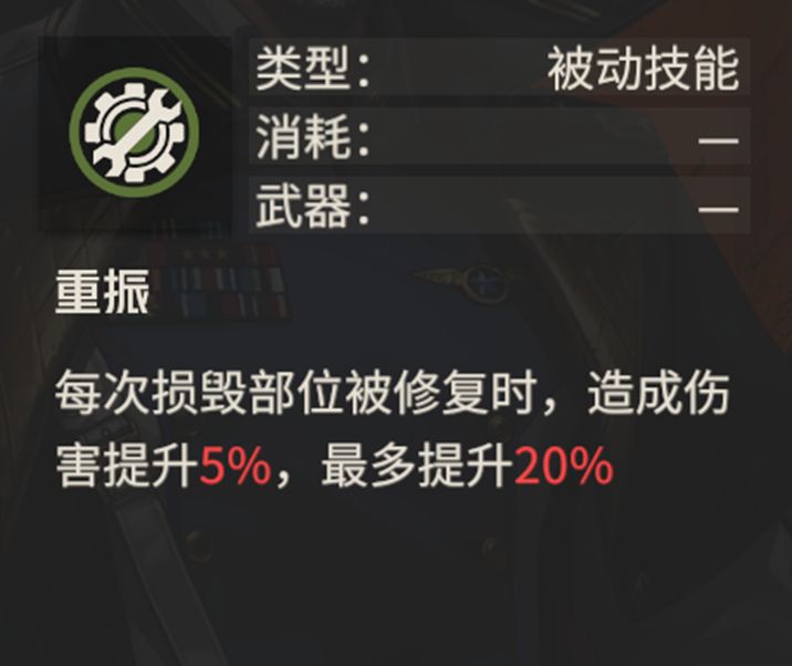 重振:守护者主要任务并不是输出,增伤技能相较而言本就没有那么重要,更何况此技能生效条件较为苛刻,不仅要求部位破损,还需要修复后才能生效,相当于需要先挨一顿打,再发力,总体效果并不好