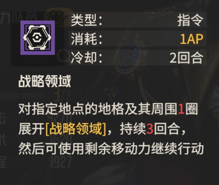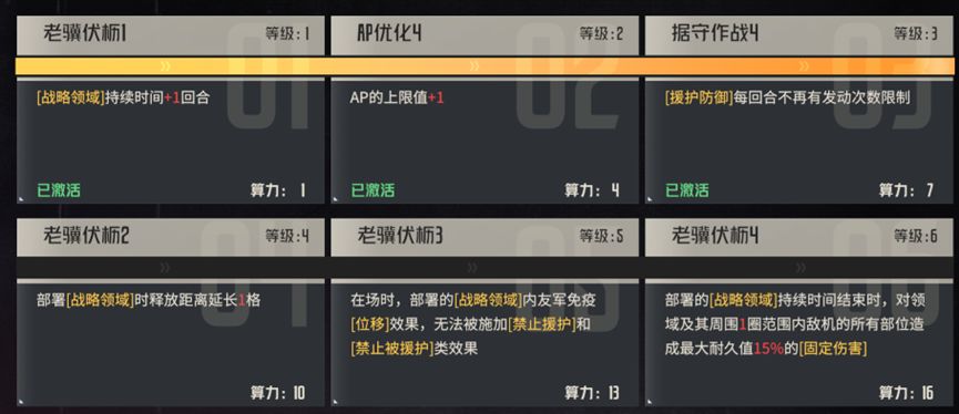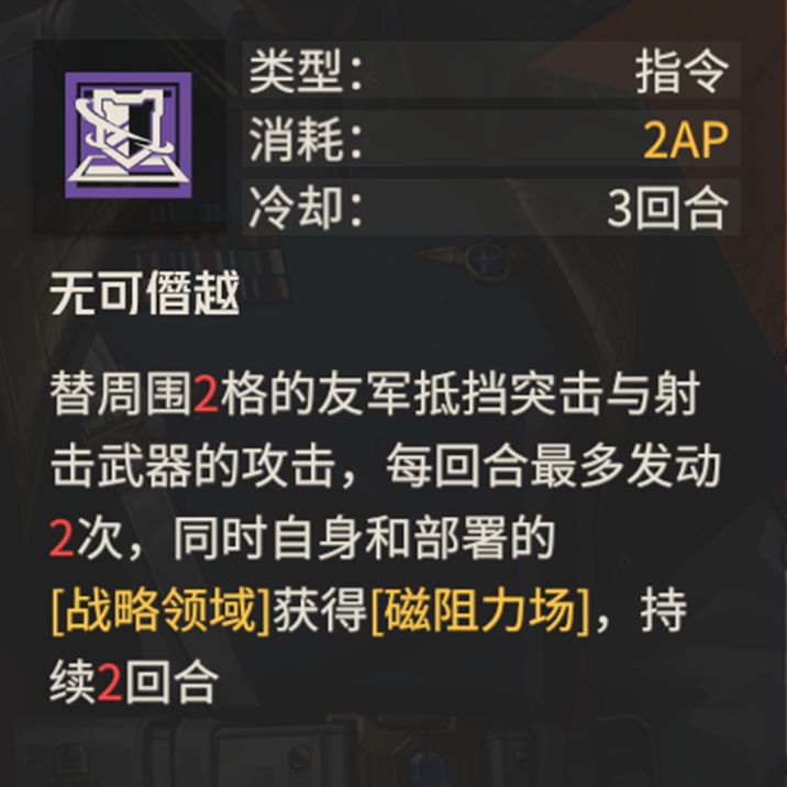 无可僭越:2格范围援护技能,与“战略领域“具有联动效果,使”战略领域“和自身获得”磁阻力场“效果,让敌人经过战略领域和自身时,额外消耗1点移动力,并且飞行背包失效。在阵地战时,能够有效限制敌方的走位。