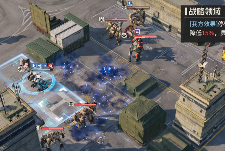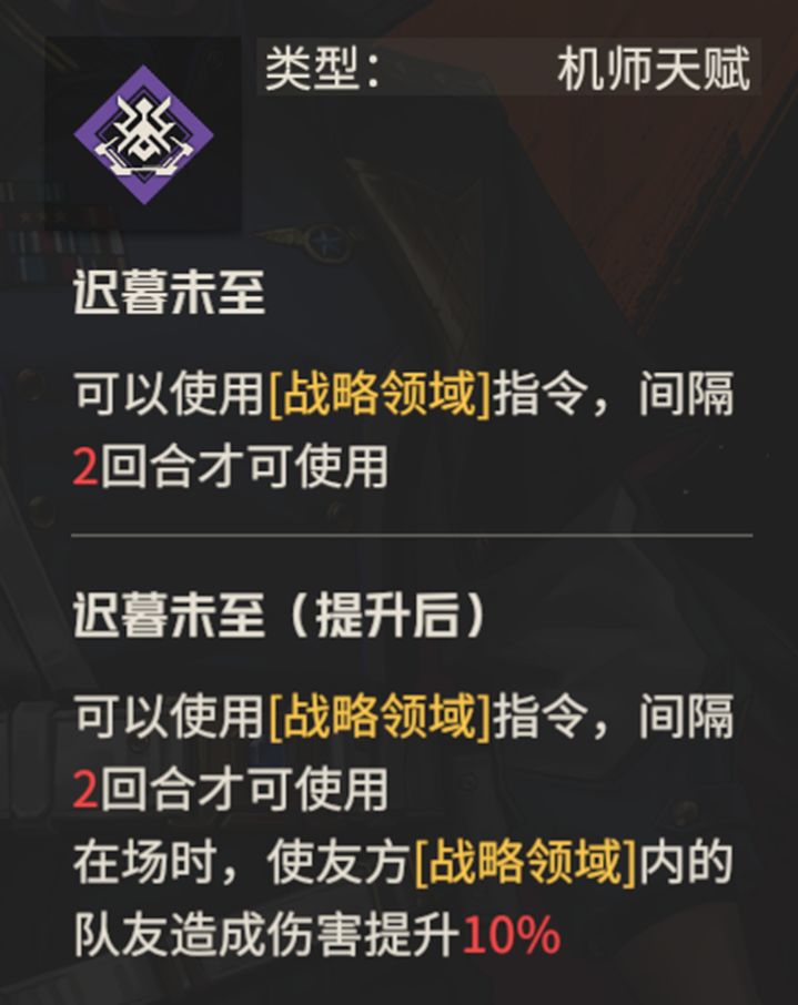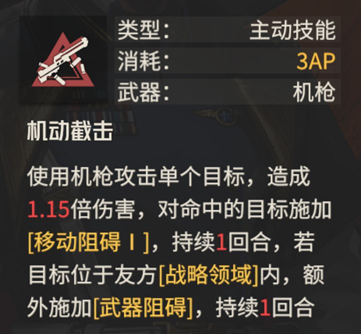 机动截击:具备功能性的输出技能,能够降低敌人的移动力,在追击和拉扯敌人的过程中,往往具有不错的效果。对处在友方战略领域内的目标还能够额外施加“武器阻碍“,使其只能进行普通攻击,造成沉默效果。